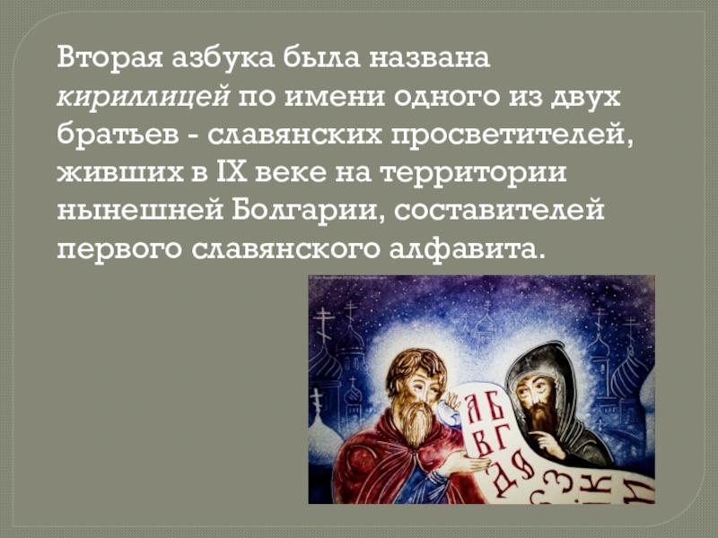 Вторая азбука была названа кириллицей по имени одного из двух братьев - славянских просветителей, живших в IX