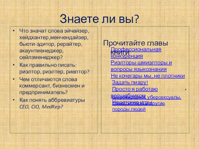 Что значат слова эйчайзер, хейдхантер,менчендайзер, бьюти-эдитор, рерайтер, акаунтменеджер, сейлзменеджер?