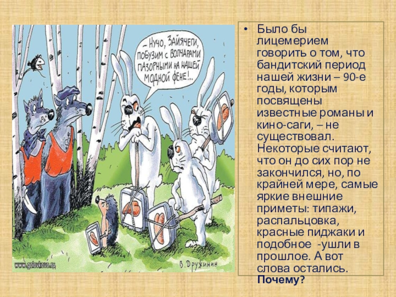 нашей жизни – 90-е годы, которым посвящены известные романы и кино-саги, – не существовал. Некоторые считают, что он до сих пор не закончился, но, по крайней мере, самые яркие внешние приметы: типажи, распальцовка, красные пиджаки и подобное -ушли в прошлое. А вот слова остались. Почему?