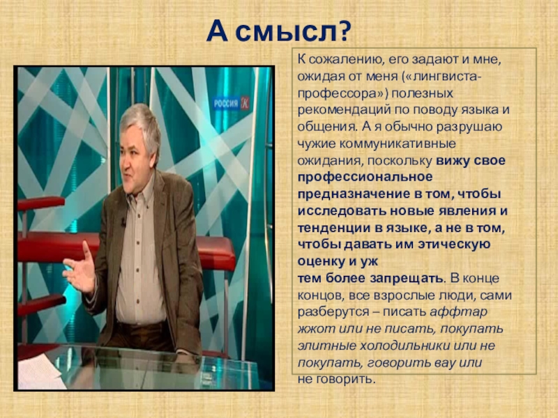 ожидания, поскольку вижу свое профессиональное предназначение в том, чтобы исследовать новые явления и тенденции в языке, а не в том, чтобы давать им этическую оценку и уж