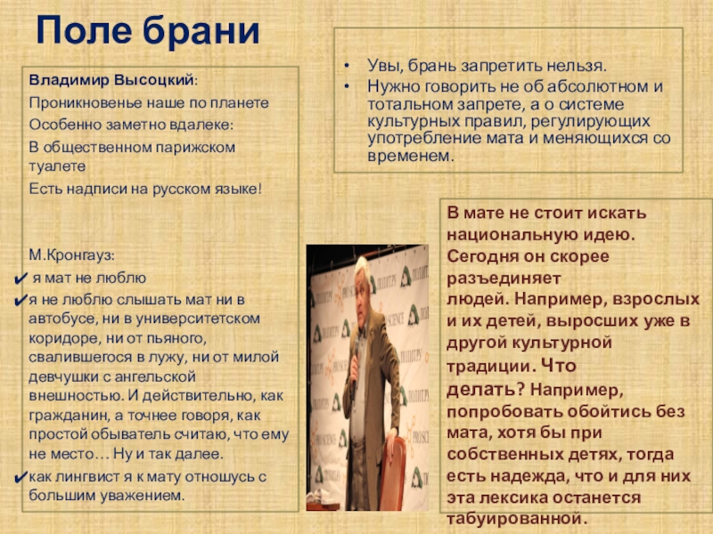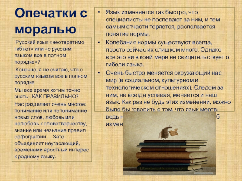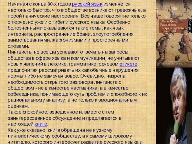 в обществе возникают тревожные, а порой панические настроения. Все чаще говорят не только о порче, но уже и о гибели русского языка. Особенно болезненными оказываются такие темы, как язык интернета, распространение брани, злоупотребления заимствованиями, жаргонизмами и просторечными словами.