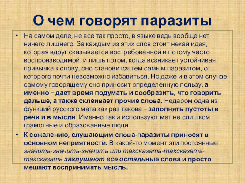 языке ведь вообще нет ничего лишнего. За каждым из этих слов стоит некая идея, которая вдруг оказывается востребованной и потому часто воспроизводимой, и лишь потом, когда возникает устойчивая привычка к слову, оно становится тем самым паразитом, от которого почти невозможно избавиться. Но даже и в этом случае самому говорящему оно приносит определенную пользу, а именно – дает время подумать и сообразить, что говорить дальше, а также склеивает прочие слова. Недаром одна из функций русского мата как раз такова – заполнять пустоты в речи и в мысли. Именно так и используют мат не слишком грамотные и образованные люди.