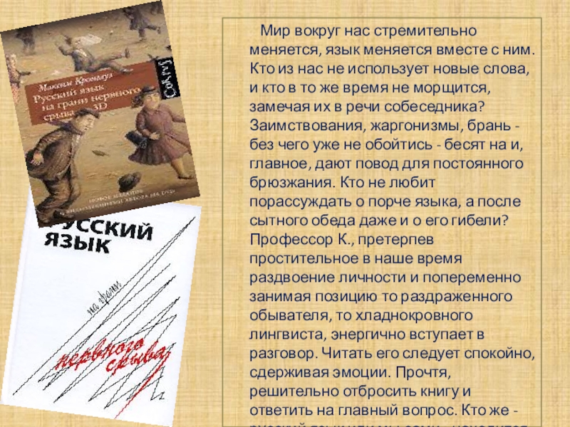 меняется вместе с ним. Кто из нас не использует новые слова, и кто в то же время не морщится, замечая их в речи собеседника? Заимствования, жаргонизмы, брань - без чего уже не обойтись - бесят на и, главное, дают повод для постоянного брюзжания. Кто не любит порассуждать о порче языка, а после сытного обеда даже и о его гибели? Профессор К., претерпев простительное в наше время раздвоение личности и попеременно занимая позицию то раздраженного обывателя, то хладнокровного лингвиста, энергично вступает в разговор. Читать его следует спокойно, сдерживая эмоции. Прочтя, решительно отбросить книгу и ответить на главный вопрос. Кто же - русский язык или мы сами - находится на грани нервного срыва?