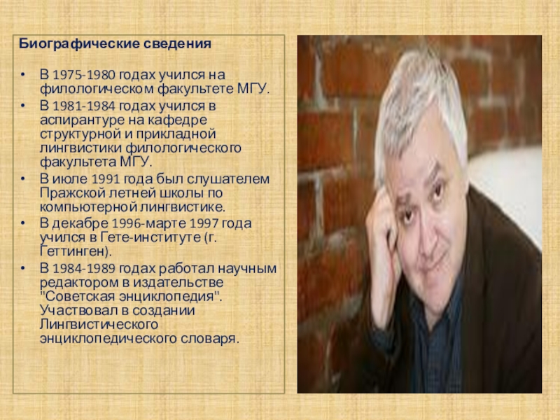 годах учился в аспирантуре на кафедре структурной и прикладной лингвистики филологического факультета МГУ.