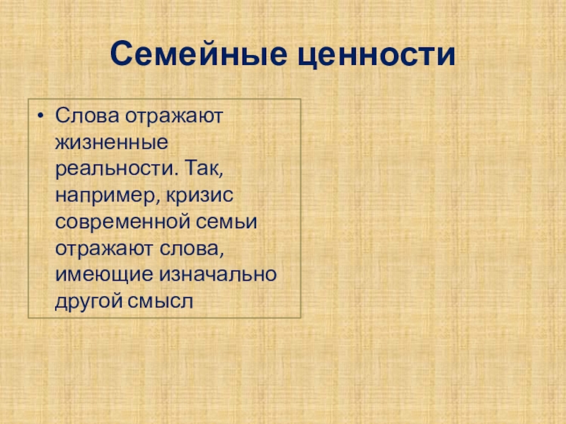 Слова отражают жизненные реальности. Так, например, кризис современной семьи отражают