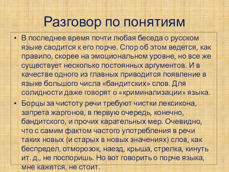 сводится к его порче. Спор об этом ведется, как правило, скорее на эмоциональном уровне, но все же существует несколько постоянных аргументов. И в качестве одного из главных приводится появление в языке большого числа «бандитских» слов. Для солидности даже говорят о «криминализации» языка.