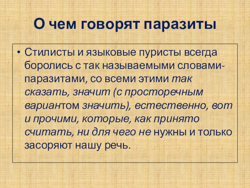 называемыми словами-паразитами, со всеми этими так сказать, значит (с просторечным вариантом значить), естественно, вот и прочими, которые, как принято считать, ни для чего не нужны и только засоряют нашу речь.