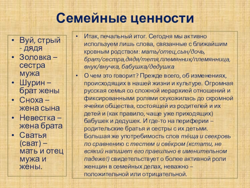 Итак, печальный итог. Сегодня мы активно используем лишь слова, связанные с ближайшим кровным родством: мать/отец,сын/дочь,брат/сестра,дядя/тетя,племянник/племянница, внук/внучка, бабушка/дедушка