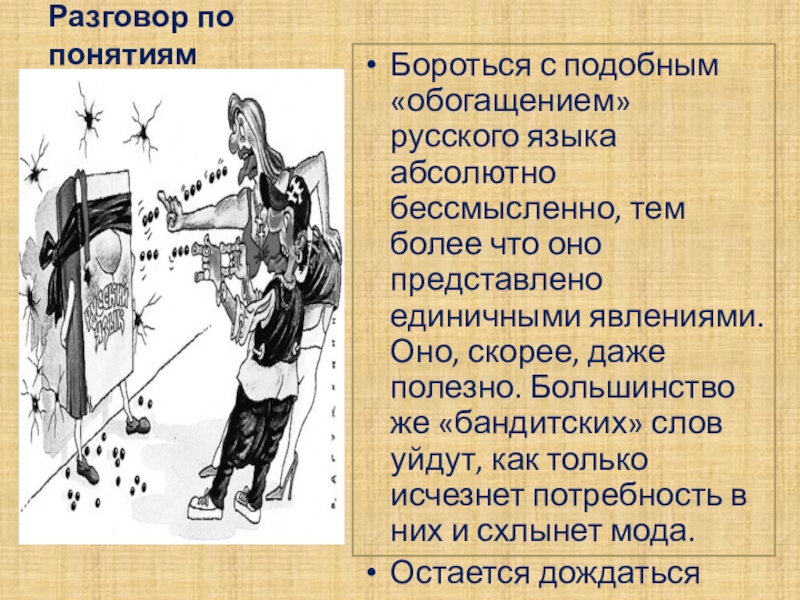 более что оно представлено единичными явлениями. Оно, скорее, даже полезно. Большинство же «бандитских» слов уйдут, как только исчезнет потребность в них и схлынет мода.