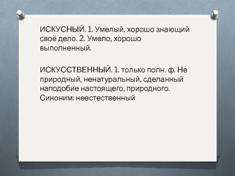 Слайд 12ИСКУСНЫЙ. 1. Умелый, хорошо знающий своё дело. 2. Умело, хорошо выполненный.