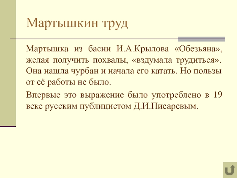 Мартышкин трудМартышка из басни И.А.Крылова «Обезьяна», желая получить похвалы, «вздумала трудиться». Она нашла чурбан и начала его