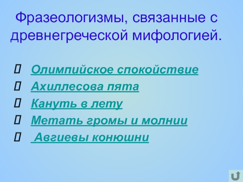 Фразеологизмы, связанные с древнегреческой мифологией. Олимпийское спокойствиеАхиллесова пятаКануть в летуМетать громы и молнии Авгиевы конюшни