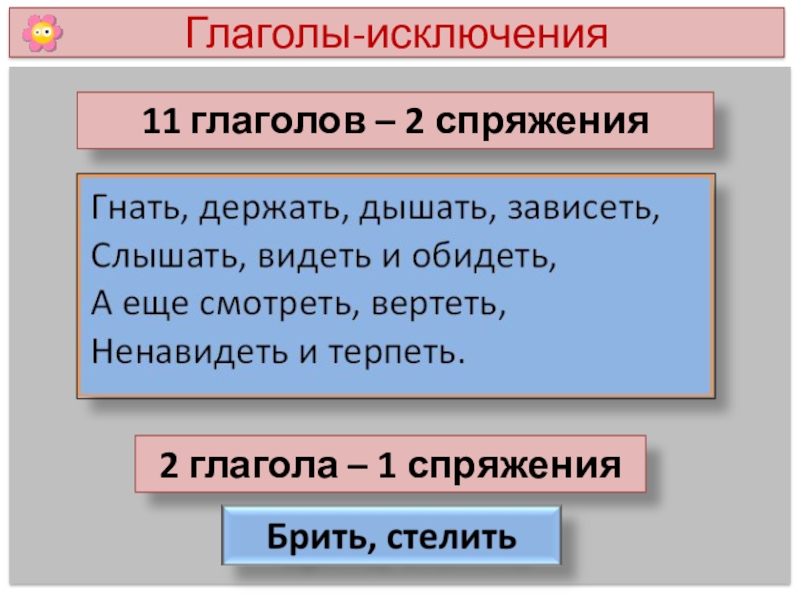 11 глаголов – 2 спряженияГлаголы-исключения2 глагола – 1 спряжения