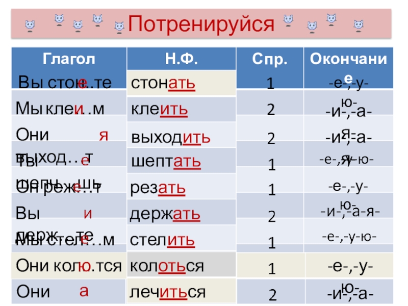 ПотренируйсяВы стон..теМы кле…мОни выход…тТы шепч…шьОн реж…тВы держ…теМы стел…мОни кол...тсяОни леч…тсястонатьклеитьвыходитьрезатьдержатьстелитьколотьсялечиться12-е-,-у-ю--и-,-а-я--е-,-у-ю--и-,-а-я--и-,-а-я-еияюа-е-,-у-ю-шептать