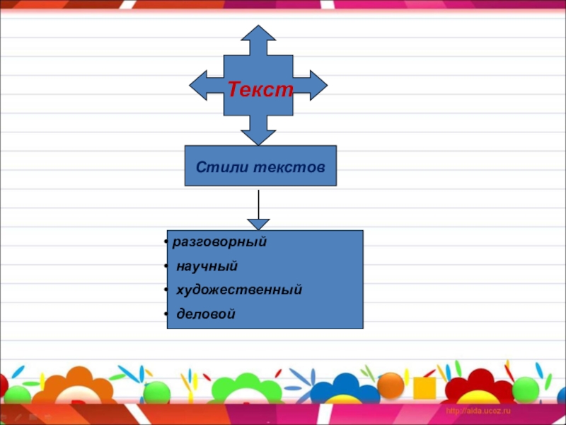 ТекстСтили текстов разговорный  научный  художественный деловой