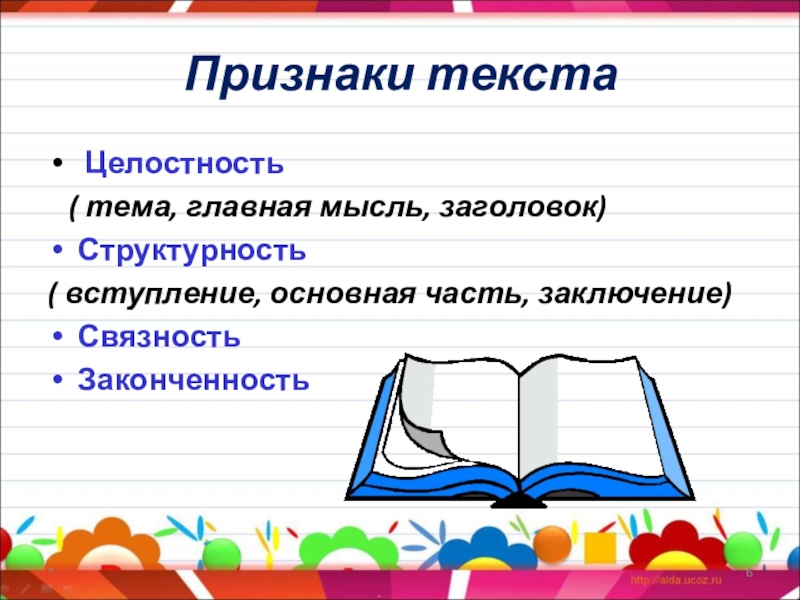 Признаки текста * Целостность  ( тема, главная мысль, заголовок)Структурность ( вступление, основная часть, заключение)Связность Законченность