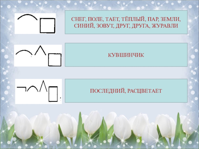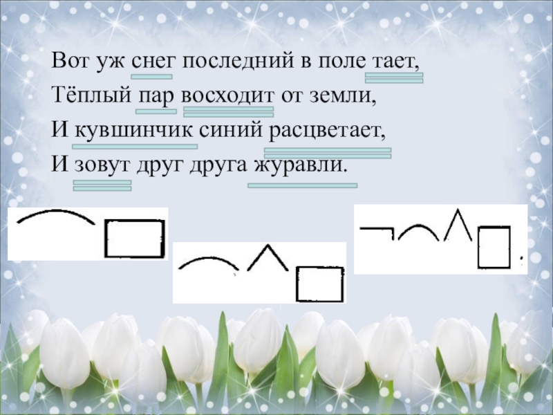 СНЕГ, ПОЛЕ, ТАЕТ, ТЁПЛЫЙ, ПАР, ЗЕМЛИ, СИНИЙ, ЗОВУТ, ДРУГ, ДРУГА, ЖУРАВЛИКУВШИНЧИКПОСЛЕДНИЙ, РАСЦВЕТАЕТ