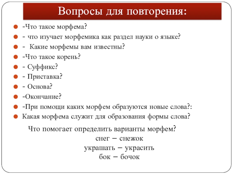 Вопросы для повторения:-Что такое морфема?- что изучает морфемика как раздел науки о языке?- Какие морфемы вам известны?-Что
