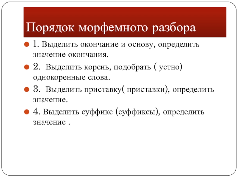 Порядок морфемного разбора1. Выделить окончание и основу, определить значение окончания.2. Выделить корень, подобрать ( устно) однокоренные слова.3.