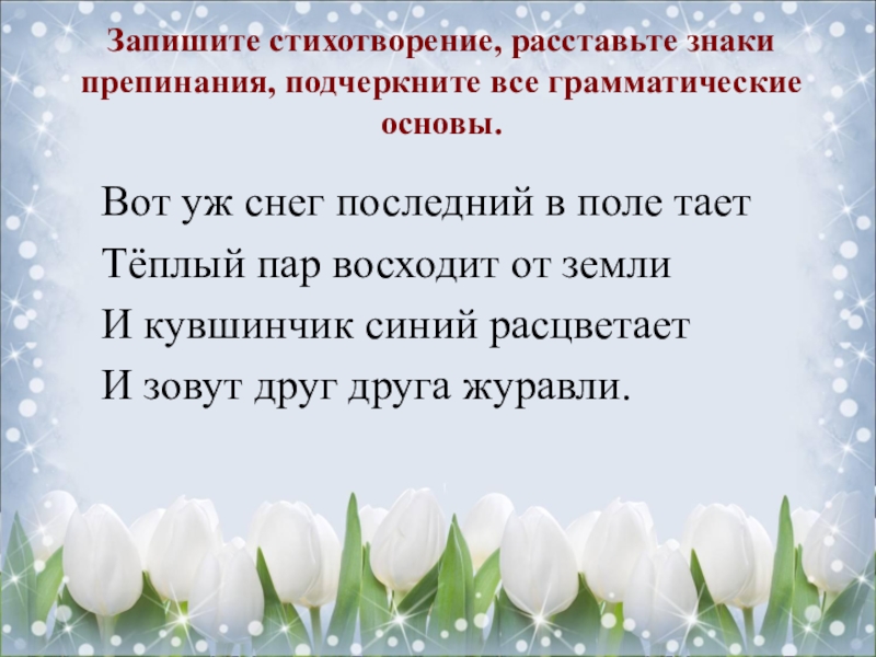 Слайд 4Запишите стихотворение, расставьте знаки препинания, подчеркните все грамматические основы.