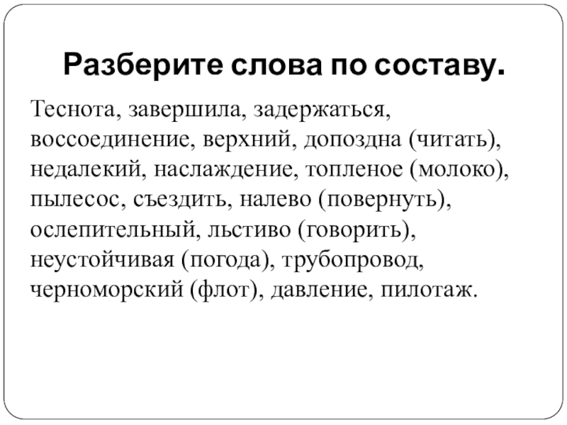 Разберите слова по составу.Теснота, завершила, задержаться, воссоединение, верхний, допоздна (читать), недалекий, наслаждение, топленое (молоко), пылесос, съездить, налево