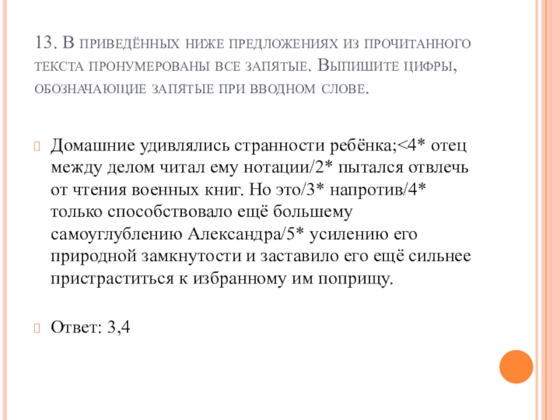 Домашние удивлялись странности ребёнка;<4* отец между делом читал ему нотации/2* пытался отвлечь от чтения военных книг. Но это/3* напротив/4* только способствовало ещё большему самоуглублению Александра/5* усилению его природной замкнутости и заставило его ещё сильнее