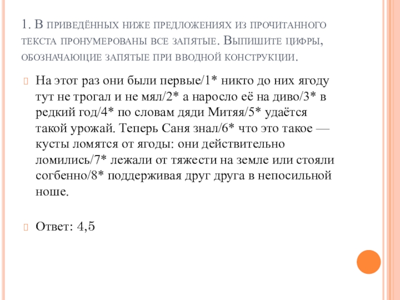 На этот раз они были первые/1* никто до них ягоду тут не трогал и не мял/2* а наросло её на диво/3* в редкий год/4* по словам дяди Митяя/5* удаётся такой урожай. Теперь Саня знал/6* что это такое — кусты ломятся от ягоды: они действительно ломились/7* лежали от тяжести на земле или стояли согбенно/8* поддерживая друг друга в непосильной