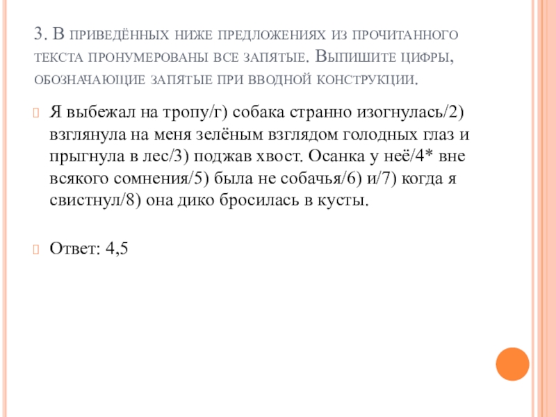 Я выбежал на тропу/г) собака странно изогнулась/2) взглянула на меня зелёным взглядом голодных глаз и прыгнула в лес/3) поджав хвост. Осанка у неё/4* вне всякого сомнения/5) была не собачья/6) и/7) когда я свистнул/8) она дико бросилась в кусты.