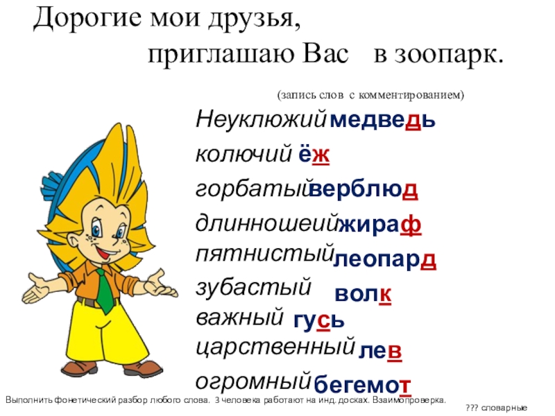 Выполнить фонетический разбор любого слова. 3 человека работают на инд. досках. Взаимопроверка.