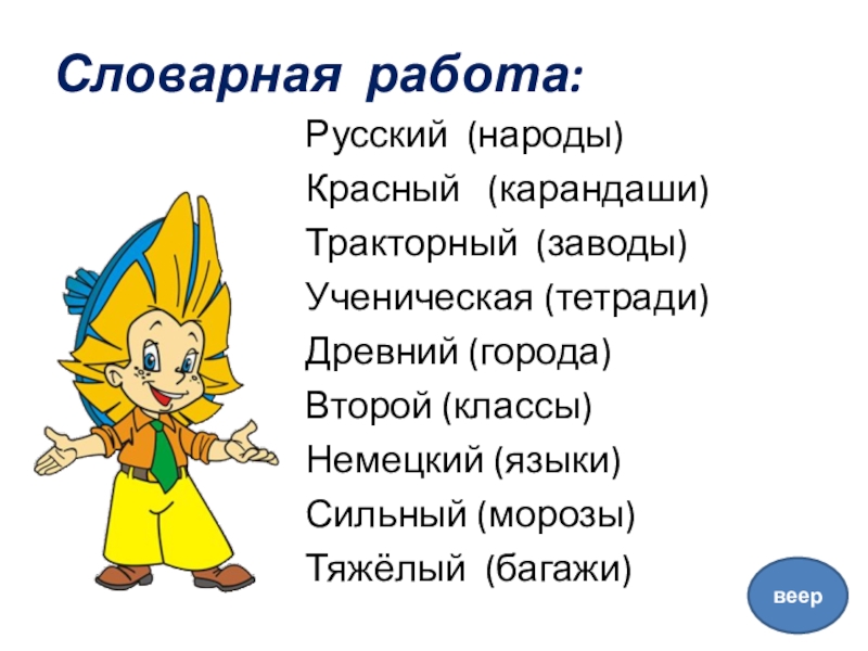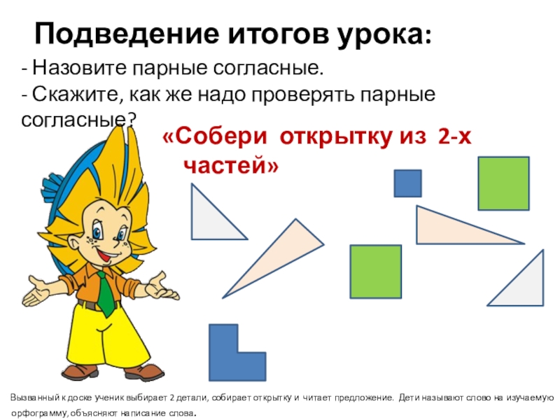 Вызванный к доске ученик выбирает 2 детали, собирает открытку и читает предложение. Дети называют слово на изучаемую