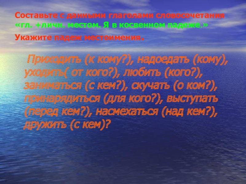 Приходить (к кому?), надоедать (кому), уходить( от кого?), любить (кого?), заниматься (с кем?), скучать (о ком?), принарядиться (для кого?), выступать (перед кем?), насмехаться (над кем?), дружить (с кем)?