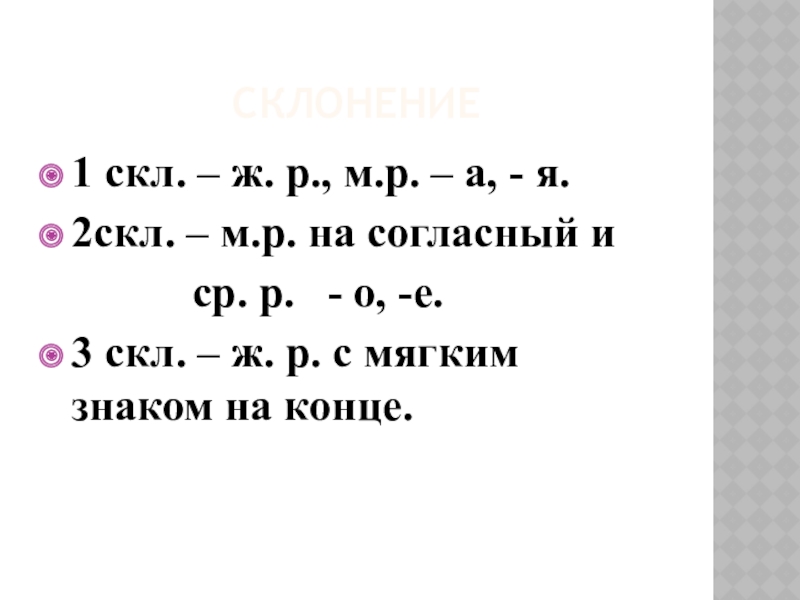 Склонение1 скл. – ж. р., м.р. – а, - я. 2скл. – м.р. на согласный и