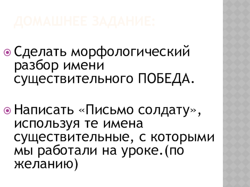 Домашнее задание:Сделать морфологический разбор имени существительного ПОБЕДА.Написать «Письмо солдату», используя те имена существительные, с которыми мы работали