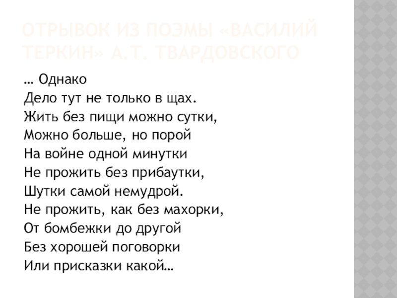 Отрывок из поэмы «Василий теркин» А.т. твардовского… ОднакоДело тут не только в щах.Жить без пищи можно сутки,
