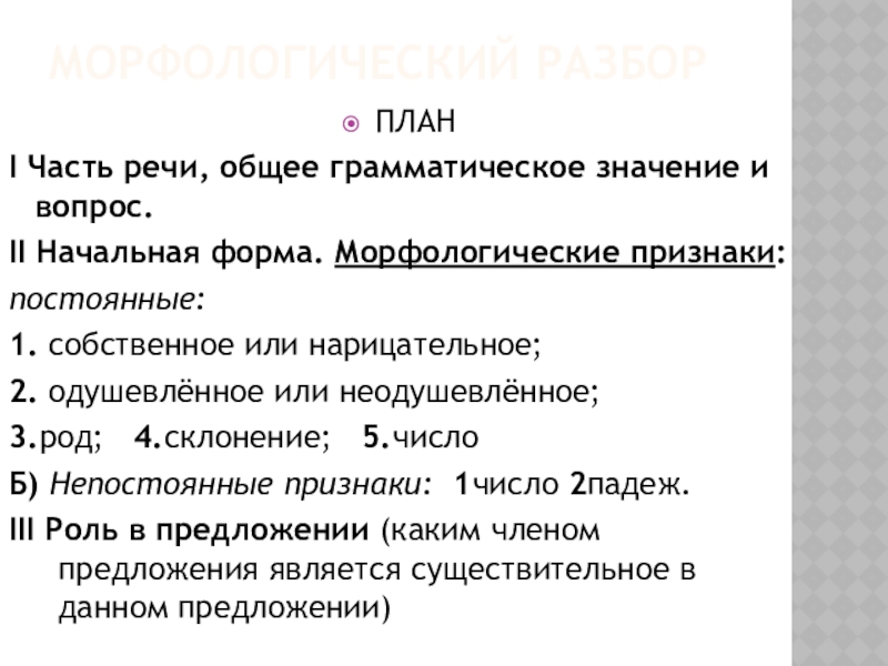 Морфологический разборПЛАНI Часть речи, общее грамматическое значение и вопрос.II Начальная форма. Морфологические признаки:постоянные: 1. собственное или нарицательное;2.