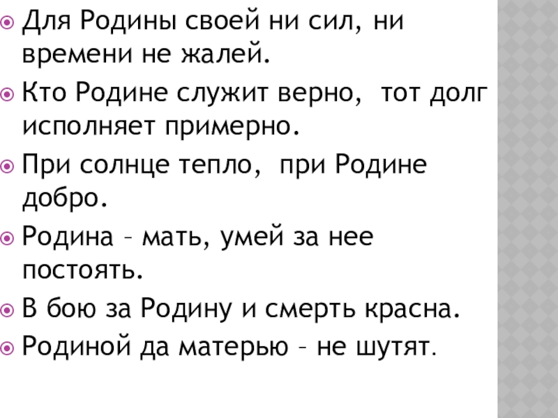 Для Родины своей ни сил, ни времени не жалей. Кто Родине служит верно, тот долг исполняет примерно.При