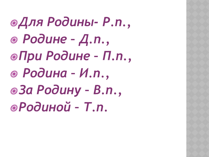 Для Родины- Р.п., Родине – Д.п.,При Родине – П.п., Родина – И.п.,За Родину – В.п., Родиной –