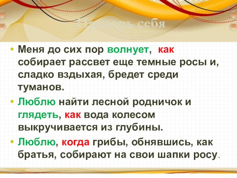 как соб … рает рассвет еще темные росы и сладко вздыхая бр …дет среди туманов. Люблю найти лесной р… дничок и гл…деть как вода колесом выкручивается из глубины. Люблю когда грибы обнявшись как братья соб … рают на свои шапки росу.