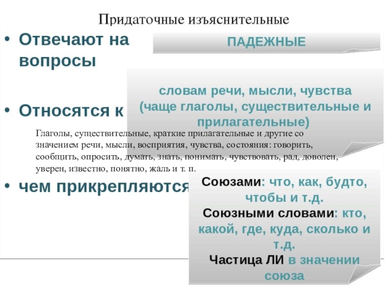 чувства, состояния: говорить, сообщить, опросить, думать, знать, понимать, чувствовать, рад, доволен, уверен, известно, понятно, жаль и т. п.