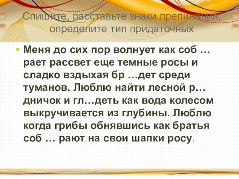 Слайд 15Спишите, расставьте знаки препинания, определите тип придаточных