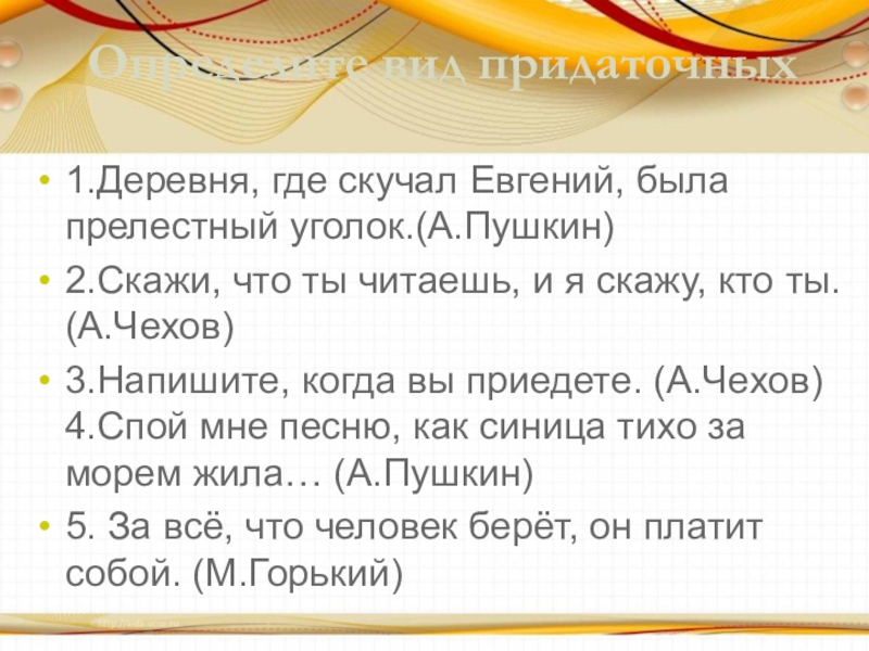 3.Напишите, когда вы приедете. (А.Чехов) 4.Спой мне песню, как синица тихо за морем жила… (А.Пушкин)