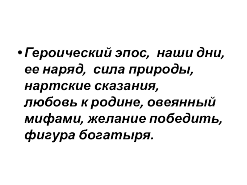 Слайд 7Героический эпос, наши дни, ее наряд, сила природы,