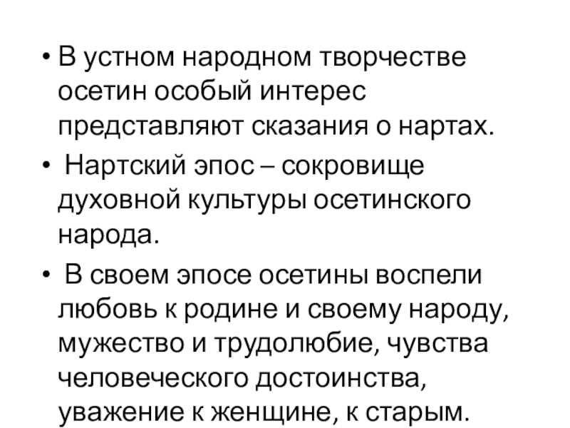 Слайд 4В устном народном творчестве осетин особый интерес представляют сказания о нартах.