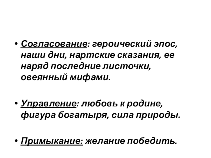Слайд 9Согласование: героический эпос, наши дни, нартские сказания, ее наряд последние листочки,