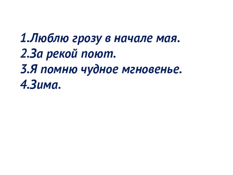 1.Люблю грозу в начале мая.2.За рекой поют. 3.Я помню чудное мгновенье.4.Зима.