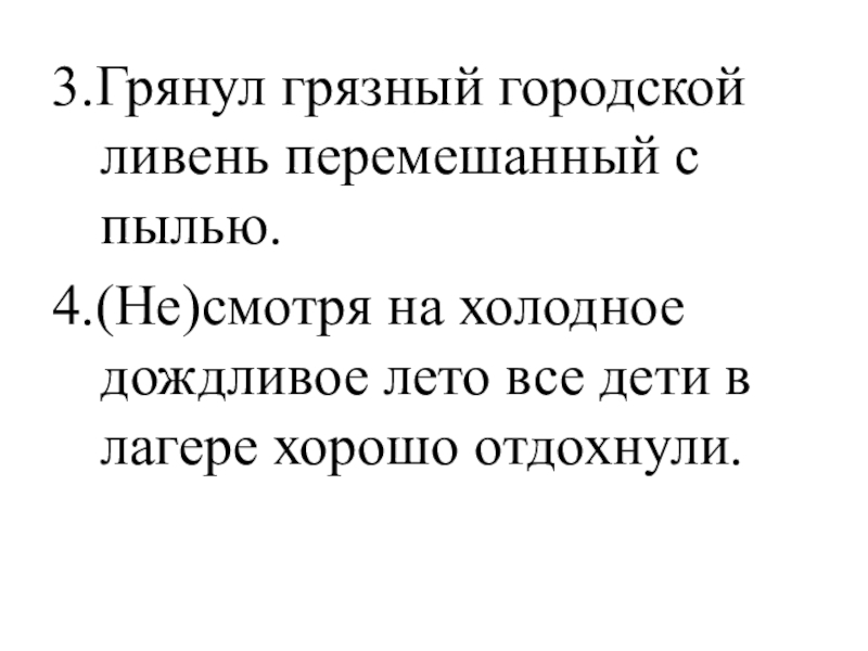 3.Грянул грязный городской ливень перемешанный с пылью.4.(Не)смотря на холодное дождливое лето все дети в лагере хорошо отдохнули.