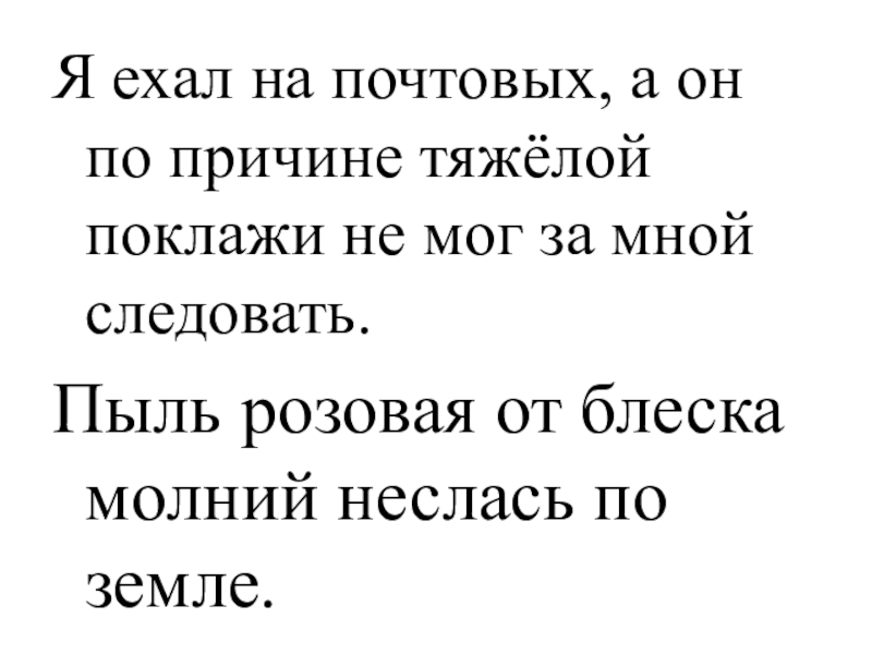 Слайд 11Я ехал на почтовых, а он по причине тяжёлой поклажи не