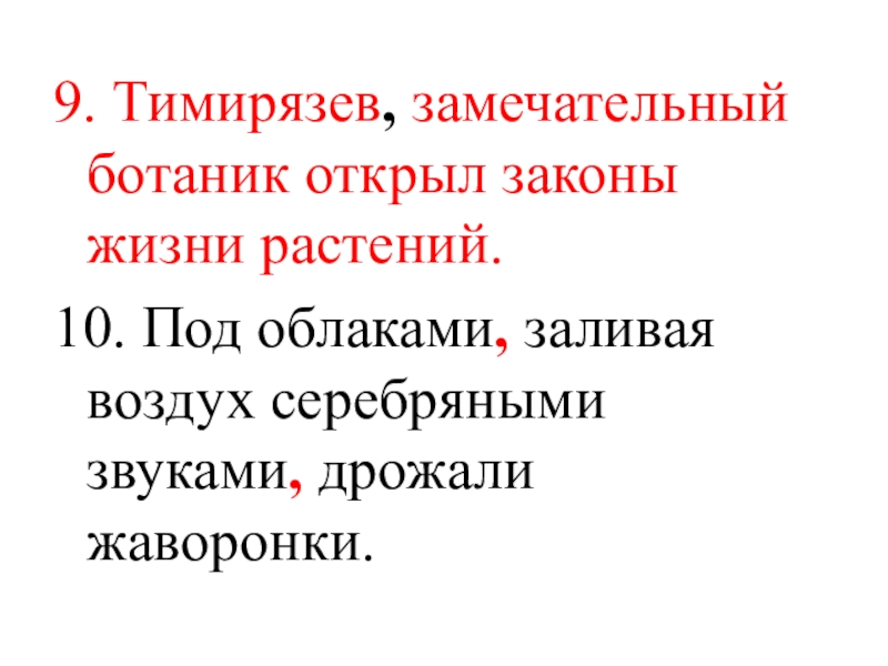 9. Тимирязев, замечательный ботаник открыл законы жизни растений.10. Под облаками, заливая воздух серебряными звуками, дрожали жаворонки.