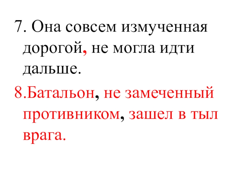 7. Она совсем измученная дорогой, не могла идти дальше.8.Батальон, не замеченный противником, зашел в тыл врага.