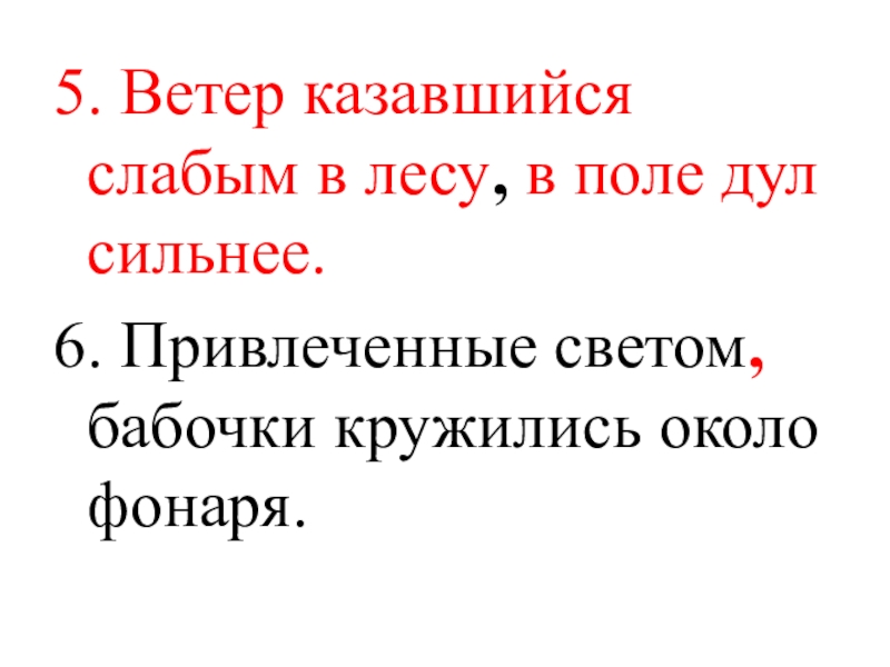 5. Ветер казавшийся слабым в лесу, в поле дул сильнее. 6. Привлеченные светом, бабочки кружились около фонаря.